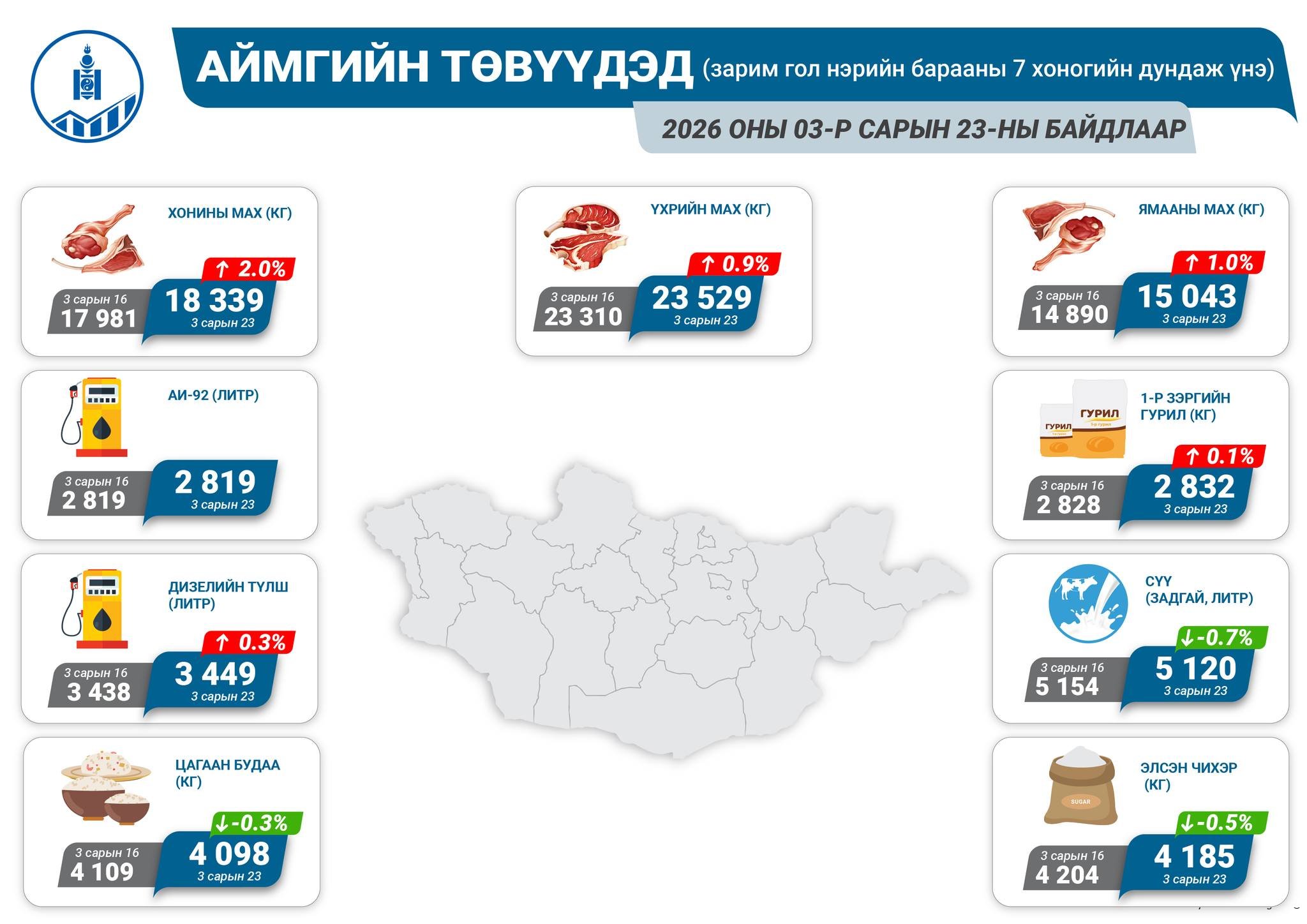 Харин аймгийн төвүүдэд 2026 оны 3 дугаар сарын 23-ны байдлаар зарагдаж байгаа гол нэрийн зарим хүнсний барааны дундаж үнэ дараах байдалтай байна.