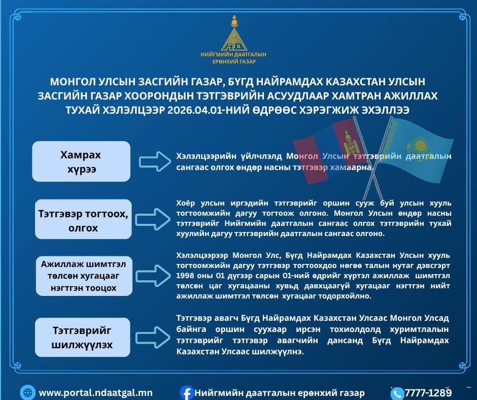 “Монгол Улсын Засгийн газар, Бүгд Найрамдах Казахстан Улсын Засгийн газар хоорондын Тэтгэврийн асуудлаар хамтран ажиллах тухай хэлэлцээр” (цаашид “Хэлэлцээр” гэх)-ийг Улаанбаатар хотноо 2024 оны 10 дугаар сарын 29-ний өдөр байгуулсан. Улмаар Монгол Улсын Их Хурлаар 2025 оны 11 дүгээр сарын 05-ны өдөр соёрхон баталсан. Энэхүү Хэлэлцээр 2026 оны 04 дүгээр сарын 01-ний өдрөөс эхлэн хэрэгжиж эхэллээ.
